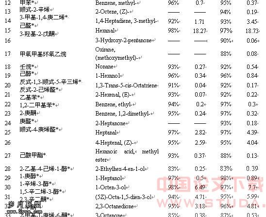 被检出的醇类化合物主要是 1-戊烯-3-醇、顺式-2-戊烯醇、1-辛烯-3-醇、1,5-辛二烯-3-