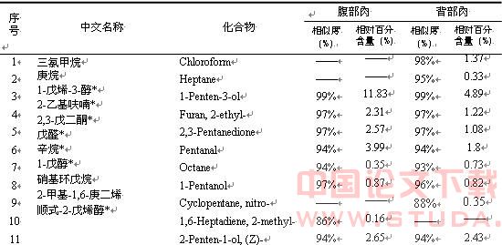 表 1 美国红鱼腹部肉和背部肉中的挥发性组分