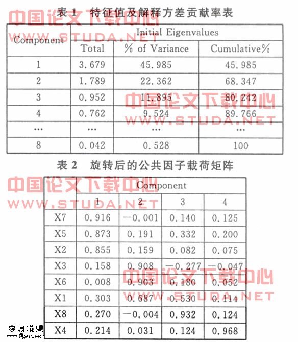 指标相关矩阵的特征值及其贡献率表(见表1)。表中4个公共因子特征值累计贡献率为89.766%大于 85%,也就是说4个公共因子基本上能表达8个指标所包含的信息。