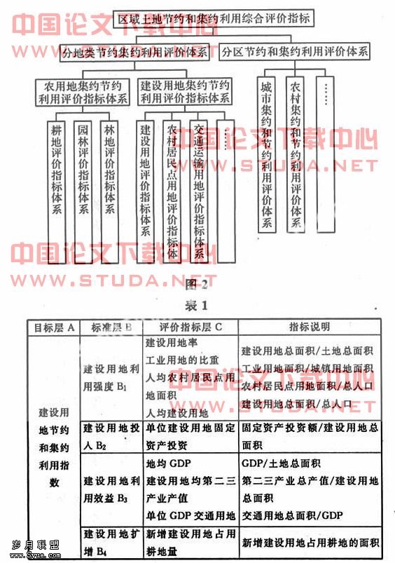 ①对于一个区域的土地节约和集约利用情况的综合评价指标的构建,主要从分地类和分区域两种方法入手。分地类节约和集约利用评价指标体系又分为农用地和建设用地两大类,分区节约和集约利用评价指标体系又分为城市和等类型。再往下分,农用地节约集约利用评价指标体系又分为耕地评价指标体系、园地评价指标体系、林地评价指标体系三个小类。建设用地节约集约利用评价指标体系又分为城镇用地评价指标体系、农村居民点评价指标体系和运输用地评价指标体系等类型。如图2: