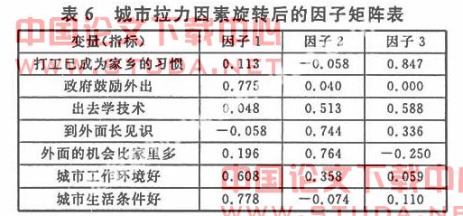 第一个因子在“城市生活条件好”、“城市工作环境好”和“政府鼓励外出”这三个指标上有较大的载荷,他们的系数分别为0.778,0.608,.0775。前两个指标很明显反映了城市良好的社会环境,“政府鼓励外出”是城市的良好社会环境在农村的折射,从侧面反映了城市的拉力作用。因此,我们把以这三个指标为基础的因子1称为“城市社会环境”因子。