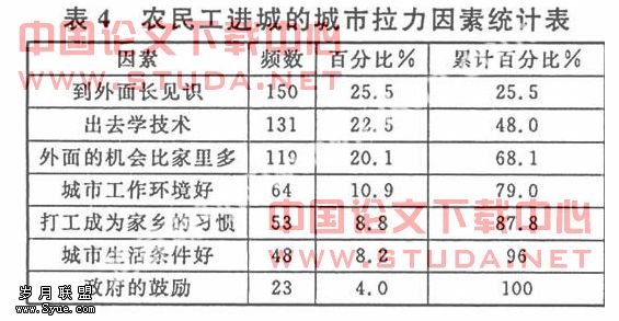 (3)农民工进城不是因为单纯的农村社会制度的障碍,也不仅仅是城市社会制度的吸引,而是一个农村推动和城市拉动组成的同向的合力的作用。是我们讨论的导致农民工流动的第一个“推——拉”作用,它促使了农民由农村到城市的单向流动。