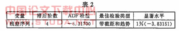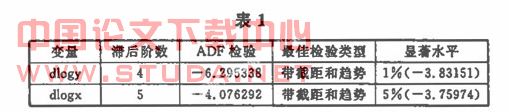 通过表1中数据可以看出dlogy在1%的水平上拒绝存在单位跟,说明此时的序列是平稳的,同理,dlogx在5%的水平上拒绝存在单位根。现在的两组数列都是一阶单整序列。
