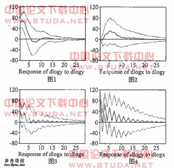 协整检验很好的反映了农民人均收入和农业基础设施投资之间的长期均衡关系,脉冲响应函数是在误差项上加上一个标准差大小的冲击对内生变量的当期值和未来值所带来的影响。这里取对数差分化后的农村居民人均纯收入和对数差分化后的财政支农支出作为内生变量,图中实线部分是值,虚线为响应函数值的两倍标准差置信带。横轴代表滞后阶数,纵轴代表对冲击的响应程度。
