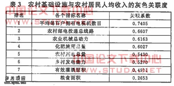 表中数据可以看出与农村居民人均收入关联度最高是平均每百户拥有的电视机数目,达到了0.7405,其次是农村邮电投递总线路的长度和农业机械总动力,分别为0.6607和0.6163,其次是化肥施用总量,农村用电总量,乡村发电能力和有效灌溉面积、粮食面积。