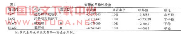 由于是时间序列模型,为了避免伪回归的产生,需要在回归分析之前对经济变量进行平稳性检验,本文采用ADF即扩展的迪基—富勒检验法,我们可以得出如表1的结果。
