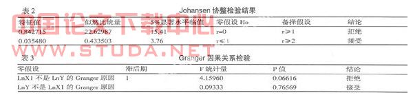 协整检验的基本思想是:两个(或两个以上)非平稳的时间序列,若它们是同阶单整的,则变量之间的某种线性组合可能是平稳的,即变量之间可能存在着长期稳定的均衡关系。通常有两种方法用来检验变量之间的协整关系,一种是EG两步法;一种是Johansen极大似然估计法。采用EG两步法,样本容量必须充分大,否则得到的协整参数估计量将是有偏的,而且样本容量越小,偏差越大。本文中用于分析的有效样本相对较小,故为克服小样本条件下EG两步法参数估计的不足,本文采用Johansen极大似然估计法对变量进行协整检验。 在进行检验之前,首先对建立的VAR系统确立合理的滞后期,这里根据无约束VAR模型的残差分析和AIC准则确定其最优滞后期为2,由于协整检验选择的滞后阶数等于无约束VAR模型的最优滞后阶数减1,因此,协整检验的最优滞后阶数为1。对LnY和LnX1的长期关系进行检验,检验结果如表2。