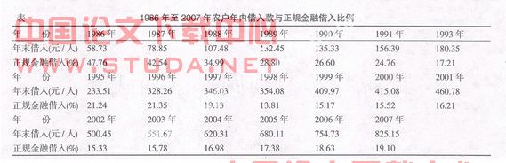在我国,农户借贷资金供给的来源有以下两类:第一类:农村正规金融机构:其中,农村信用合作社是农户借贷资金重要的一个来源,是正规金融中支援农业的主力军;其他的正规金融机构还包括中国农业银行,农村合作基金会。另一类是农村的非正规金融,包括民间自发金融和民间的金融组织(比如合会、标会等)。农村信用合作社是合作性质的农村金融,它发放贷款的重点是农户。2008年,从正规金融机构获得贷款的人数不足贷款人数的1/3,在以前的年份获得贷款的农户的数量甚至更少。这里只包括获得贷款的农户的数量,并不足以说明获得贷款的农户的资金需求完全获得满足。这说明农村信用合作社对农户提供的资金只能部分满足农户的资金需求。中国农业银行在1996年前贷款的重点中有农户,但在这之后农行提出了“向城市进军”的口号,对农业贷款的重点由农户转变为农业的龙头以及农业的产业化发展。自此之后,农行对农户贷款的数量下降很快,在现阶段农行仅向农户发放抵押贷款。农村合作基金会是近年来在农村地区出现的准金融组织,是社区性质的资金互助合作组织。它灵活的经营方式,简便的手续等特点,使其发展很快,并在一定程度上解决了农户贷款难的问题。但由于发展过快,存在着高息揽存、违规放款等现象,所以,大部分的农村合作基金会已经被清理整顿和关闭了。民间借贷是农户经常借款的渠道,农户民间借贷与正规金融存在着一点程度的此消彼长的替代效应。由于农户在正规金融渠道借款存在着一定的困难,所以不得不求助于民间借贷。民间借贷的形式不仅仅包括农户之间的自由借贷,也包括有组织的私人钱庄,合会,典当行等。据农村固定观察点1986年至2007年的数据(见下表)显示农户借贷的数量在22年间有较大的增长,增长了大约13倍,但是农户从银行等正规机构得到贷款比重却在年间下降了39.63%,因此可以说民间借贷在正规金融无法满足农户资金需求的情况下,起到了很重要的替代和补充的作用。总的来看,农户借贷资金中,民间借贷扮演着重要的角色,正规金融很难完全满足农户的资金需求,农户存在着贷款难的问题。