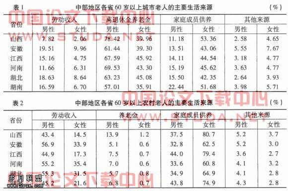 通过对中部地区城乡60岁以上老年人口养老现状(主要是生活来源)的对比,可发现以下问题:一是城乡老人养老生活来源不同,农村男性老人主要依靠劳动收入,女性主要依靠家庭成员供养;城市老人主要依靠离退休金和养老金,也有45%的女性主要依靠家庭成员供养。二是农村老人依靠养老金的比例很低,男性平均不足8%,女性则不到1%。说明我国农村的社会养老保障还很薄弱。上述数据不仅告诉我们中部地区60岁以上的农村老人中仍有50%以上男性老人要靠劳动收入养老,70%以上的女性老人要依靠家庭成员供养养老这一现状,而且这些状况和农民收入增长缓慢、中部地区年轻劳动力大量外流等实际问题相结合,更加剧了中部地区农民养老问题的严重性。