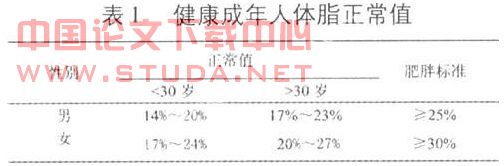 在进行肥胖诊断时应考虑体脂百分比,以鉴定因肌肉体重过大而引起的BMI值增高。健康成年人正常值见表1。