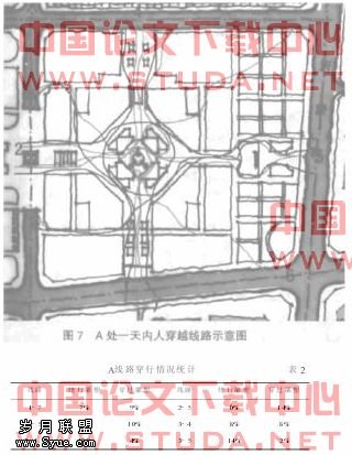 人民广场的地理位置是决定人流方向与大小的主要因素(图6)。人的行为本身具有就近的天性,尤其在目的地可见并且障碍物可穿越时,必然会选择最直接的线路。由于该节点位于几个较大的商业服务与饮食娱乐之间,必然增加了该处的被穿越人次,从而使穿越该区的线路变的较为复杂(图7、表2)