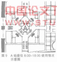 通过对该节点座位使用情况的统计(图9),仍是南侧两处的使用频率较高。双向座位人们选择面对雕塑(即a、b、c、d方向)的比率为30%,有多数人选择面对绿化——柔性的绿色空间的方向(即图中A、B、C、D方向)。可以看到,物质环境的优劣不仅影响人们的行为模式,而且影响到人们的行为取向。如同界的向光性一样,人类对于优良的物质空间环境也有潜在的趋向性。