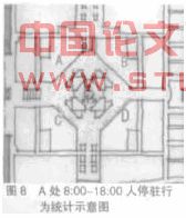 笔者通过对该节点调研可见,雕塑周围A、B、C、D4块草坪边均设置可坐设施,在统计时间内A、B与雕塑东北的E点停驻行为使用频率最高。仔细分析原因,发现此三处多有树阴或阴影可遮阳。1、2、3、4的使用频率不同也是同一个道理。停驻行为反映环境质量的直观程度由此可见一斑(图8)。