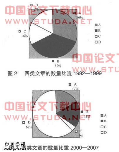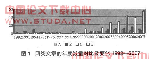 我们由图1可以看出,A、B、C题域的文章数量从1992—2007年均呈现出较为稳定的缓慢增长趋势,但自2000年之后D题域文章大幅度的增长且占到研究总量的主体(如图3),这表明中国的公民社会研究自2000年之后呈现出了多元化特征(当我们仅仅分别以“NGO”、“非政府组织”和“民间团体”为检索关键词以与样本同样的方式在中国期刊全文数据库中检索时就可以找到409篇文章,这与我们整个样本中的文章数量大体相当。);而在2000年之前D题域的文章较少,A、B题域的文章占研究总量的主体(如图2),这表明中国的公民社会研究在2000年之前主要是对西方公民社会理论的译介及对中国公民社会生成或发展的思索。由此我们可以将公民社会研究在中国的演进以2000年界划分为两个阶段:2000年之前为公民社会研究在中国的理论译介期,2000年之后为公民社会研究在中国的理论拓展期。