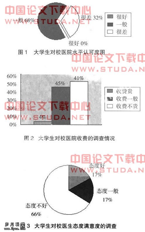 1.大学校医院医疗水平、服务态度有待提高。通过对大学校医院医疗水平、收费及服务态度的调查,基本情况是: