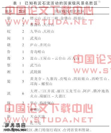 泥石流是我国山区常见的一种自然现象。它常发生在山区小溪沟,是各种自然因素和人为因素综合作用的结果。泥石流因其形成过程复杂,爆发突然,来势凶猛、历时短暂,破坏力大,因而成为山区经济建设的一大灾害[1]。泥石流对旅游业干扰很强,例如,北京市山地旅游区多位于泥石流易发山区,特别是官厅水库以下、石景山以上的山峡地区是北京市发生泥石流最典型的地区,而康西草原、十三陵水库、八达岭长城、香山等重要旅游景点均位于该区。我国国家级风景名胜区中已知有泥石流活动的有33处[2](见表1)。泥石流常毁坏旅游设施,危害游客安全,影响旅游功能的发挥和正常运营,尤其是某旅游区泥石流灾害如果造成重大人员伤亡,将对该旅游区旅游需求产生长期的负面影响。因此,研究旅游区泥石流灾情,对减灾、防灾以及旅游区管理具有积极的作用。