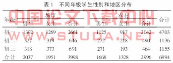 对象 1998年12月,采取分层随机整群抽样的方法,分别从武汉市11个区中随机抽取1所学校,然后按照办学条件、升学率和学校规模相近的配比条件,从各区中随机抽取另一所学校,再从每所学校的初一年级中随机抽取4个班,从初二和初三中随机各抽取一个班共计22个学校, 7129人作为本次的研究对象。由于学生缺课和家长拒绝的原因,最后实际回收问卷6994份,应答率为98%。