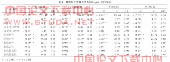 按性别分析,在男生中,学校的正性和负性事件与四个吸烟指标均有关(负性: OR=1.07-1.25,正性: OR=0.67-0.85),家庭负性事件与尝试吸烟、30天吸烟和7天吸烟正相关(OR=1.04-1.09);在女生中,学校负性事件与尝试吸烟, 30天吸烟和7天吸烟正相关(OR=1.07-1.18),学校正性事件则与前两个变量呈负相关(OR=0.80-0.93),家庭负性事件与尝试吸烟呈正相关(OR=1.05),与小伙伴有关的负性事件与吸烟习惯呈正相关(OR=1.95),与小伙伴有关的正性事件与7天吸烟率呈负相关(OR=0.83),经统计学检验,差异均有显著性意义(P<0.05)。