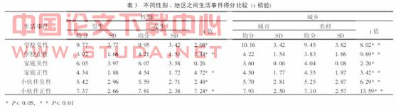 女生在所有生活事件得分上均高于男生,除家庭负性生活事件外,差异均有显著性意义(P<0.05);除家庭负性生活事件农村得分高于城市外,其余各生活事件得分农村均低于城市(P<0.05)。结果见表3。