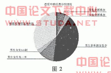 在恋爱消费分担问题上,只有7%的人选择了由男生全部承担,42%的人认为男生多承担一点,女生少承担一点;34%的人认为应当根据经济情况的好坏来承担;这和以前的全部由男生承担的旧观念有了很大的不同和改变。对于女生多承担,男生少承担的选项数据竟为0,可见,传统的男性处于经济的领导与付出地位的思想影响仍很强大。(见图2)?