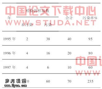 三年污染率显著不同,明显减低。1995年5次水污染40份样有38份污染超标,占全年正常水样(304份) 12·5%,有2次检出痢疾杆菌、变形杆菌两种致病菌, 1996年2次水污染20份样品有16份污染超标占全年5·2%,有1次检出痢疾致病菌, 1997年1次水污染10份样品有6份污染超标占全年2·0%,未检出致病菌。