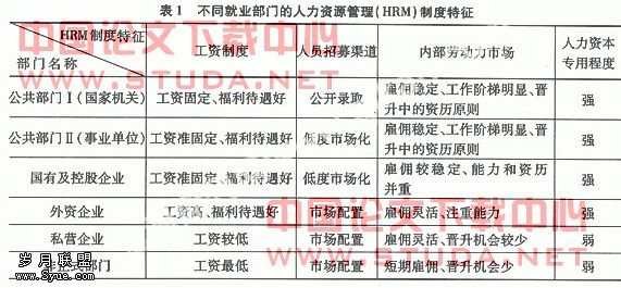 在转型期的,劳动配置尤其纷繁复杂。社会学对劳动力市场分析的“再分配一市场”框架,以及经济学的二元劳动力市场模型都显得过于简单,无法准确地把握各种组织的劳动力市场运作。因此,借用Robert Moffitt教授分部门的劳动力市场观点,结合我国劳动力市场的现状以及就业部门的制度特征,可将中国城市的就业部门划分为六个大类:公共部门Ⅰ(国家机关)、公共部门Ⅱ(事业单位)、国有及控股企业、外资企业、私营企业、非正式部门。这六种类型的就业部门在工资制度、人员招募渠道、内部劳动力市场的完整性以及人力资本的专用性等人力资源制度方面都呈现较大的差异(见表1)。