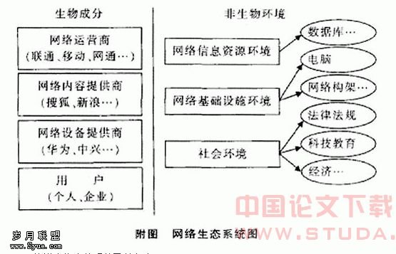 而网络运营商、内容供应商、网络设备提供商、网络用户是网络生态系统的生物成分。非生物成分主要由网络信息资源、网络基础设施、社会环境。网络信息资源主要是指各种结构化和非结构化的信息资料,如果没有信息资源,网络将是一个沙漠;网络基础设施主要是指构成网络必须有的机、输入输出设备、调制解调器、网络接入设备等;社会环境主要是指网络法律法规、社会教育、科学技术和经济的发展情况。