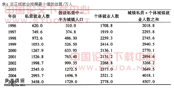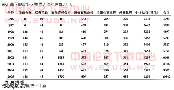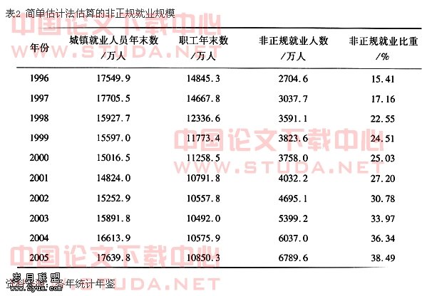 显然,这种方法只是一个粗略的估计。它的一个假设前提是职工人数等于正规就业人数,除职工外的剩余人数等于非正规就业人数,并没有考虑到正规部门里也有非正规就业人员,非正规部门里也有正规就业人员。