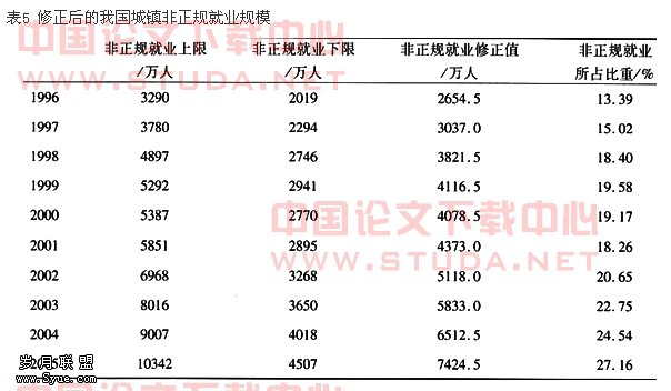 取最大值和最小值的中间值对我国城镇非正规就业人数进行修正。由表5可知,我国的城镇非正规就业人数呈逐年上升趋势,已由1996年的2654.5万人增加到2002年的5118万人。这个数字与国家劳动和社会保障部社会保险研究所课题组估算的结果基本相符。从计算的结果来看,截至2005年,我国的城镇非正规就业人数约7424.5万人。