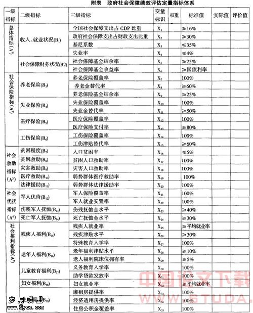 政府社会保障绩效评估定量指标体系,包括反映政府社会保障总体概况、社会保险、社会救助、社会优抚和社会福利的绩效评估指标。这些评估指标可以通过与标准值比较得到评价值(见附表)。