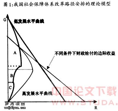 2.考虑到不同经济发展水平下社会保障体系的功能差异,我们有理由推断曲线形式会伴随经济发展水平提高而出现相应变动。当一国经济发展水平较低时,商业保险、个人帐户等保障形式的发展往往受制于交易成本和管理成本,因此人们对财政支付型社会保障具有更高的需求;而且这时增加财政给付的负向激励效应相对较小,边际收益下降相对缓慢,因此这时的曲线相对平缓;而随着一国经济发展水平的提高,因为社会保障方式的日趋多元化,人们对财政支付型社会保障的需求将逐步降低,财政给付的负向激励效应也日益突出,由此造成增加财政给付的边际收益下降速度加快,曲线的凹度提高。