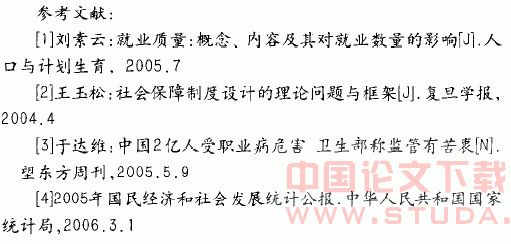 (2)各级政府部门要完善就业领域中主要的缺陷,并且要扩大对就业质量的宣传。进一步完善职业病防治的法律法规,将主要职业病纳入工伤保险范畴,既可保障劳动者权益,又分散了用人单位的经营风险,主要是完善社会保障立法。