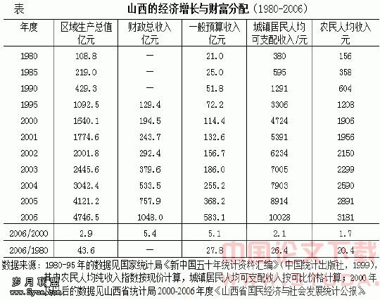 [8]山西省统计局:2001-2006年度“山西省国民经济和社会发展统计公报”,http://www.stats-sx.gov.cn/tjgb/default.htm ;山西省代省长于幼军2006年1月10日在山西省第十届人民代表大会第四次会议上所作的《政府工作报告》,2006年1月11日《山西日报》。
