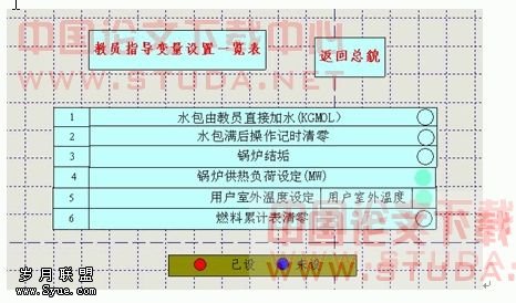培训人员通过显示屏上仿真的灯光屏,可以看到锅炉的压力、温度、流量、水位等值。培训人员通过通过显示屏上锅炉流程图上的各种阀门、挡板,可以对锅炉的运行工况进行控制。