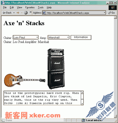 清单3展示了用ASP.NET HTMLControl写的“Axe 'n' Stacks”页面。注意到各个选择框、按钮、图像元素的布局都与传统的ASP代码的效果非常相似。当ASP.NET引擎遇到这些标记时,它们会将之映射为相应的HTMLControl。从代码可以看出,提交按钮(“Information”)被连接至消息处理例程FetchInfo_Click。注意FetchInfo_Click通过访问表单域来管理控件的方法。它首先检查传送进来的吉它、功放组合,再在文本框控件里填充入相应的内容。然后它设置好图像控件,在其中显示出正确的吉它、功放的图片。如图2。