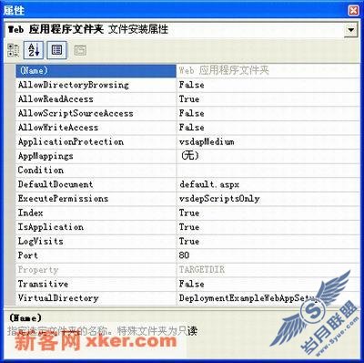 要配置虚拟目录的设置信息,首先打开文件系统编辑器,右击“Web应用程序文件夹”,选择菜单“属性窗口”,打开图六的“属性”窗口。