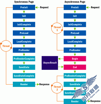 接下来的操作比较有趣。该页经历其常规处理生命周期,直到 PreRender 事件刚刚引发之后。然后,ASP.NET 调用使用 AddOnPreRenderCompleteAsync 注册的 Begin 方法。Begin 方法的任务是启动诸如数据库查询或 Web 服务调用的异步操作,并立即返回。此时,分配给该请求的线程返回到线程池。此外,Begin 方法返回 IAsyncResult,它允许 ASP.NET 确定异步操作完成的时间,这个时候 ASP.NET 从线程池提取线程并调用 End 方法。当 End 返回之后,ASP.NET 执行该页生命周期其余的部分,包括呈现阶段。在 Begin 返回以及调用 End 之间,该请求处理线程可以自由地服务于其他请求,直至调用 End 且延迟呈现为止。由于 2.0 版的 .NET Framework 提供多种执行异步操作的方式,因此,您甚至无需实现 IasyncResult。反之,Framework 替您实现。