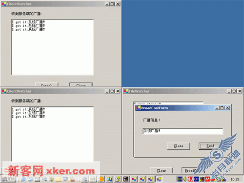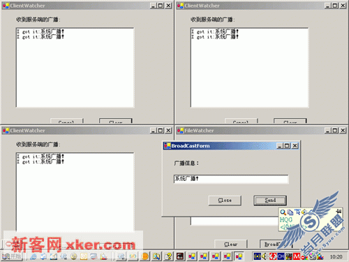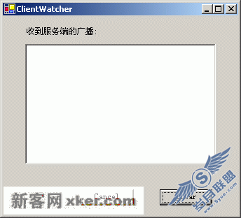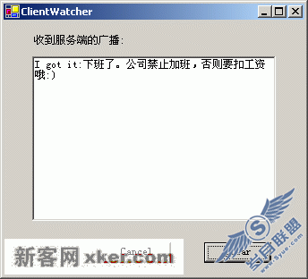 怎么样,很酷吧!你也可以同时打开多个客户端,它们都将收到这个广播信息。如果你觉得这个广播声音太吵,那就请你在客户端取消广播吧。在Cancle按钮中: