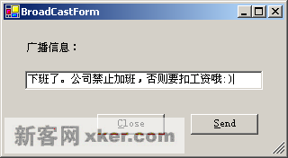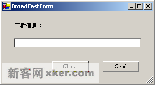 我放了一个ListBox控件来显示一些信息,例如显示服务器启动了。而BroadCast按钮就是广播消息的,单击该按钮,会弹出一个对话框: