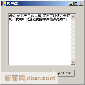 呵呵,可以说客户端激活对象的方法和普通的Remoting客户端应用程序没有什么不同。该写传真了!我们在窗体上放一个文本框对象,改其Multiline属性为true。再放一个按钮,负责发送传真: