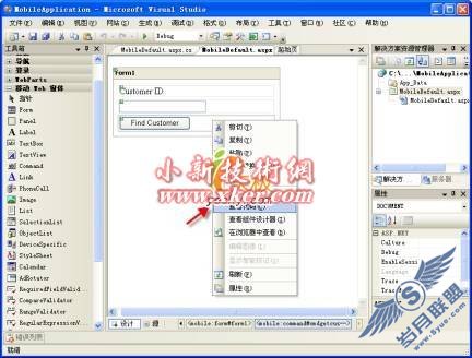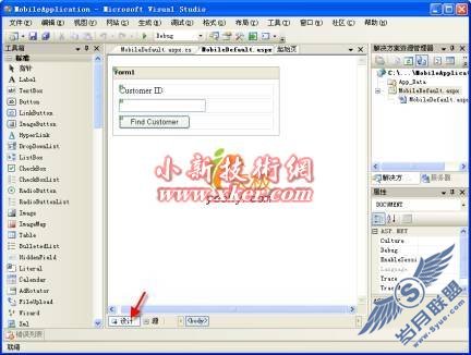 设计视图状态下将加载移动WEB窗体,并且自动呈现窗体中所包含的移动控件。你可以从工具箱中以拖拽的方式添加新的控件,你也可以通过属性窗口修改已存在的控件的属性。如果想要移除窗体中的某些控件的话,你可以点选该控件并使用"Delete"键进行删除。