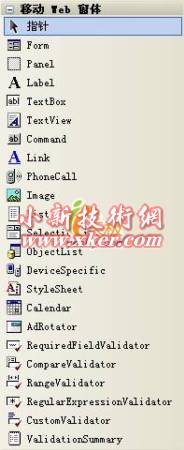 Visual Studio 2005提供了一组功能强大且友好的开发工具来创建移动WEB程序,如果你已经有创建传统的ASP.NET应用程序的经验,那么你就会发现创建移动WEB程序和创建传统的ASP.NET应用程序是非常类似的。你只需要创建一个ASP.NET项目并添加一些移动WEB窗体即可。当你添加移动WEB窗体后,你就会发现在工具箱中添加了如下图所示的ASP.NET移动控件。