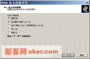 ??8.如右图,指定该站点的权限,默认为"读取"和"运行脚本",这对一般的站点而言已经足够了。有关权限的问题将在本课程的后续部分详细介绍。单击【下一步】。