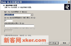 6.如上左图,为该Web站点指定IP地址,注意,在下拉列表框中可用的IP地址都是在Windows 2000中实际绑定的IP地址。同时,尽量不要改变Web站点的默认端口号(80),否则浏览器将不能访问这个Web站点(除非指定端口号)。单击【下一步】。