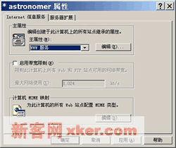 该属性表单有两个选项卡:在【Internet信息服务】选项卡中,可以分别配置WWW服务和FTP服务的主属性、计算机的总带宽截流、MIME映射等属性;在【服务器扩展】选项卡中,可以配置站点性能、客户机脚本类型、邮件发送方式、系统权限等属性。