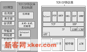 ??作为一套完整的网络通信协议结构,TCP/IP协议应称为协议组,除了其核心协议TCP和IP之外,TCP/IP协议组还包括其他一系列复杂的组件,他们包含在TCP/IP协议组的四个层次中。TCP/IP协议组四层分别是:应用层,传输层,Internet层和网络接口层。每一层都对应着国际标准化组织(ISO)定义的开放系统互连(OSI)参考模型(即7层模型)中的一层或多层。如左图所示。