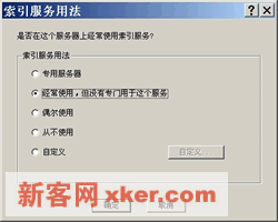 根据服务器当前承担的索引工作量和服务性质选择索引服务用法,可选的用法有:【专用服务器】、【经常使用】、【偶尔使用】、【从不使用】和【自定义】。它们所对应的规划索引工作量依次递减, 对于一般的包含索引功能的Web网站服务器,指定【偶尔使用】用法即可满足需求,如果该计算机还担当其他网络服务器的角色,最好选择【偶尔使用】用法以减少索引服务对内存等资源的占用率。??如果选择自定义方式,就可以单击【自定义】按钮进行详细配置,如右图所示。