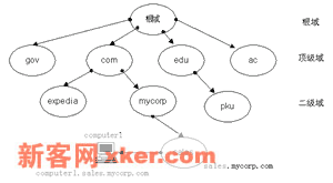 ??如右图所示,在Internet根域以下分布了若干顶级域,顶级域下又分布有二级域。这一等级结构构成了Internet资源命名机制。例如在根域下有".com "顶级域,其下又有"mycorp"二级域,名为sales的子域位于其中,该域表示为sales.mycorp.com。sales子域中有一台主机名为computer1的计算机。为了定位这台计算机上的资源, 我们需要指定全域名(FQDN)为computer1.sales.mycorp.com。[/TD]