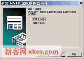 ??5.如右下图所示,选择用于保存新闻内容的存储媒体,【文件系统】或者【远程系统】。前者将文件保存在本地磁盘;后者则保存到远程计算机。单击【下一步】继续。??6.指定新闻存储路径,单击【完成】。创建虚拟目录可以拓展NNTP服务器的存储空间,亦便于管理。虚拟目录可以保存在本地或者网络中的远程计算机中。创建虚拟目录的方法如下: