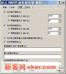 ??文章属性是指新闻组文章的大小以及连接属性,还包括邮件审查和系统管理员的账号信息。NNTP虚拟服务器属性表单的【设置】选项卡提供了上述文章属性的配置界面。【设置】选项卡包括如下内容: